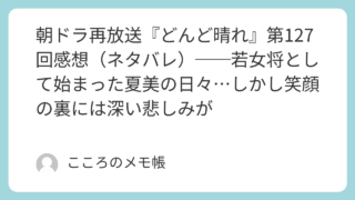2026年3月16日に放送された『どんど晴れ』第127回。カツノの葬儀が終わり、加賀美屋では新しい日々が始まった。そして夏美も、いよいよ若女将としての仕事をスタートさせることになる。これまで仲居として働いてきた夏美だが、今日からは仲居たちを...