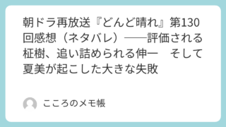 2026年3月19日に放送された『どんど晴れ』第130回。銀行から融資に前向きな反応を引き出し、加賀美屋の再建にようやく光が見えてきた第130回。だが、その前進は素直に喜べるものではなかった。家族がこぞって柾樹を評価するほど、伸一は自分の立...