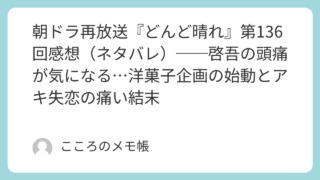 2026年3月26日に放送された『どんど晴れ』第136回。第136回は、加賀美屋の新しい企画が動き出す明るさと、イーハトーブで静かに終わってしまうアキの恋が並行して描かれた回だった。横浜では啓吾が夏美に頼まれた加賀美屋オリジナルの洋菓子につ...