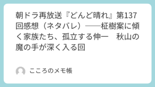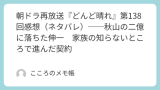 2026年3月28日に放送された『どんど晴れ』第138回。第138回は、これまでじわじわ積み上がっていた不穏が、ついに加賀美屋の表の場に噴き出した回だった。伸一は家族に隠れて秋山と株式譲渡契約を結ぼうとし、秋山が用意した二億円の振込証明書を...
