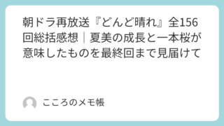 朝ドラ『どんど晴れ』を第1回から最終回まで全156回見届けた総括感想です。夏美の成長、一本桜の意味、加賀美屋の変化を振り返りながら作品全体を考察します。