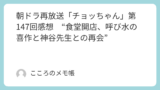 第103回は、子どもの痛み、家計の不安、恋の決断――さまざまな“痛点”が同時に押し寄せました。蝶子は支え合いの輪を広げながら、必要な医療へと舵を切ります。次回、加津子の症状はどう動くのか。要さんの向き合い方は変わるのか――見守りたいと思います。