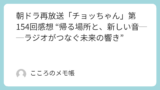 “したら”の照れと、言葉の押し出し。 玄関先での神谷(役所広司)の不器用な誘いは、安乃(貝ますみ)にとっての報い。そこから一気に縁談モードへ切り替える蝶子(古村比呂)&邦子(宮崎萬純)の“言葉で追い詰めて合意を引き出す”手さばきは、第68回で要(世良公則)を説得した時の既視感そのもの。言葉の力で未来を動かすのが、やっぱりこの主人公の真骨頂。