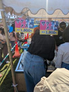 購入する際には「メスを買ったら必ず筋子が入っているのか」を店員さんに確認しました。サイズは大小さまざま並んでおり、「5,000円くらいのメス」と伝えたところ、5,500円の鮭を勧められて購入しました。売り場は活気にあふれ、やり取りをしながら選ぶのも祭りならではの楽しさです。