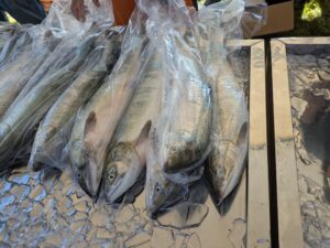 お祭りの目玉はやはり鮭。テントの下には氷漬けにされた鮭が並び、丸ごと1匹単位で販売されていました。価格は以下の通りです。