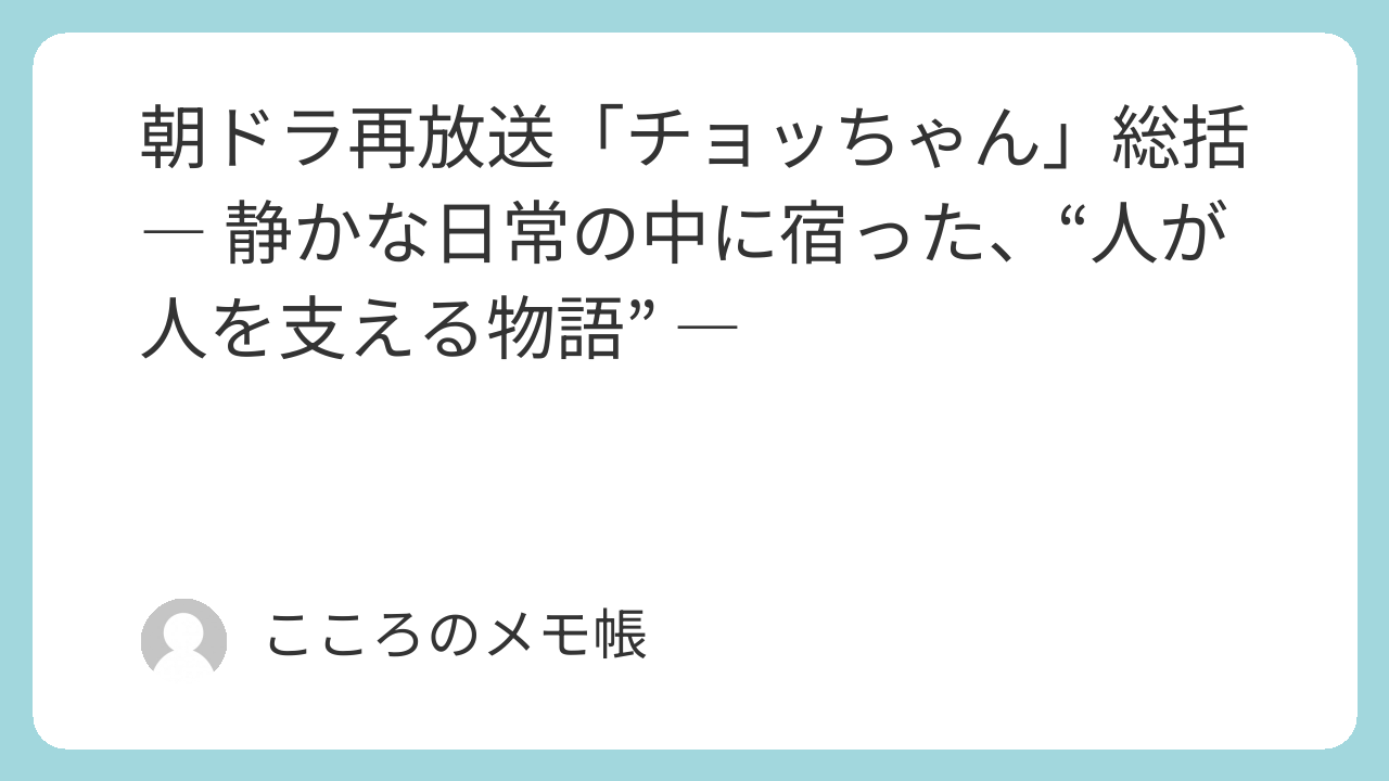 『チョッちゃん』は、時代のドラマではなく、人の生き方を描いた記録だったと思う。文春オンラインが言うように、説明ではなく“感じさせる”物語。それを毎朝体感できた半年間は、まるで誰かと一緒に暮らしていたような時間だった。
