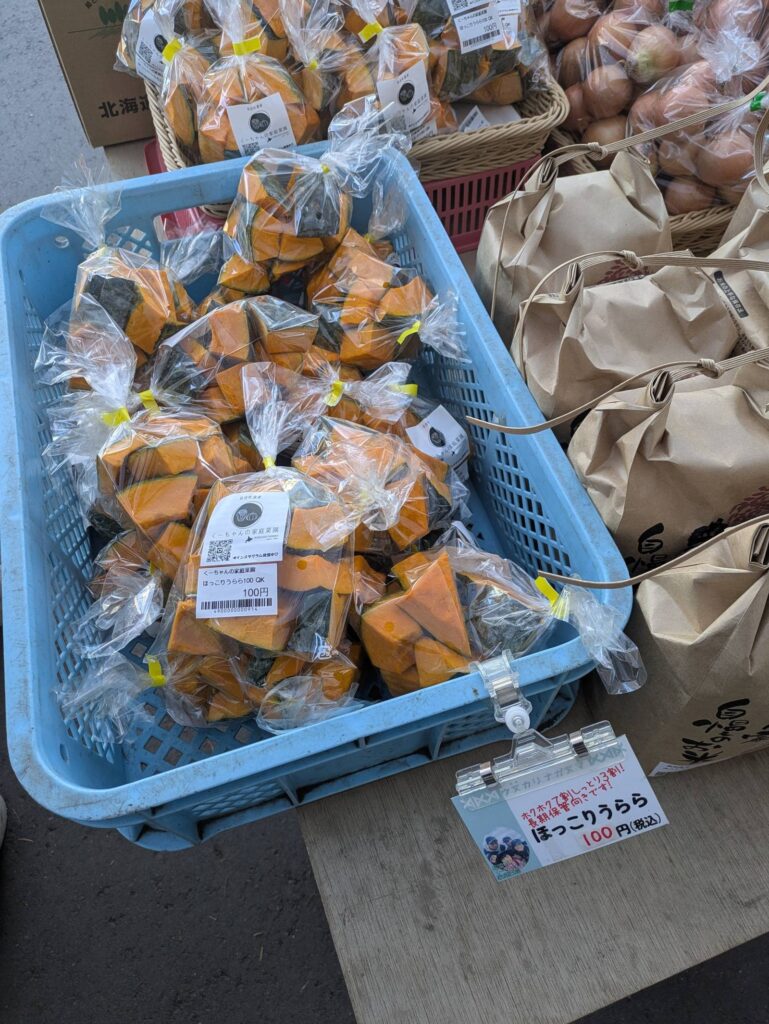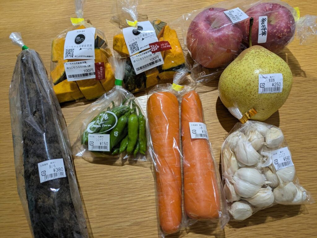今回の買い物では、夢きらら直売所で長芋・にんにく・ししとう・ニンジン・リンゴ・梨を購入。マオイの丘ファーマーズマーケットではカットされたかぼちゃを100円で購入しました。店員さんから「そのまま冷凍しても大丈夫」と教えてもらい、犬の手作りごはんにも使えるのでありがたい買い物でした。
