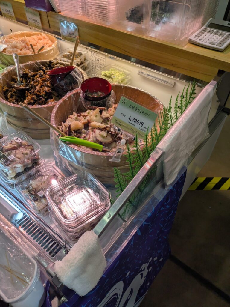 次に強烈な印象を残したのが「味遊たくみや」。特にお刺身たこわさびが絶品で、普段食べる“たこわさ”とは比べ物にならない大きなタコがゴロゴロ入っており、食べ応え抜群でした。 お刺身ほたてわさびの試食も美味しくて購入。100g税込1,296円と安くはないものの、味で納得できるクオリティでした。 さらに、あと100g買うともう100gサービスしてくれるとのことで、いかの塩辛を購入したら「いか粒うに和え」をサービスしてもらうという嬉しい展開も!