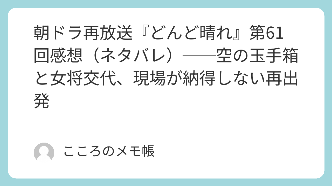 2025年12月22日放送の『どんど晴れ』第61回は、年に一度の茶会で大女将・カツノが引退を公表し、環が名実ともに九代目女将として加賀美屋を継ぐ回だった。