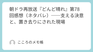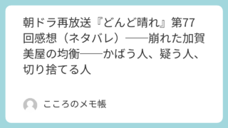 2026年1月20日放送の 『どんど晴れ』第80回は、「受け入れられる人」と「受け入れられない人」の差が描かれた。姑となったカツノの一言で、ようやく正される現場。それを素直に受け止められない彩華。柾樹の決断を理解しようとしながらも、心が追い...