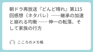 どんど晴れ 朝ドラ再放送『どんど晴れ』第115回感想(ネタバレ)──継承の加速と崩れる均衡 ── 伸一の転落、そして家族の行方 2026年3月2日放送『どんど晴れ』第115回環の決断は、静かに、しかし確実に加賀美屋の均衡を崩し始めていた。若女将になる夏美の存在感は増し、柾樹は役職にこだわらない姿勢を見せる。その一方で、伸一は融資を断られ、感情の行き場を失っていく。継... 2026.03.02 どんど晴れ朝ドラ