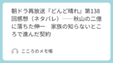 一方で、その“猶予”が新たな火種も生んでいるのも確かだった。環は納得していないし、柾樹も飲み込めていない。時江も秋山を信用していないだろう。それでも伸一だけはますます秋山に依存していく。つまり今回得られたのは解決ではなく、たった一度の猶予に過ぎない。そしてその猶予の先で、次に誰が単独で動き出すのかを考えると、むしろ柾樹の方が危うく見えてくる。第139回は、加賀美家の分裂がついに表面化した回であると同時に、ようやく“本当の意味での話し合い”が始まるかもしれない、その入り口がやっとできた回だったと思う。