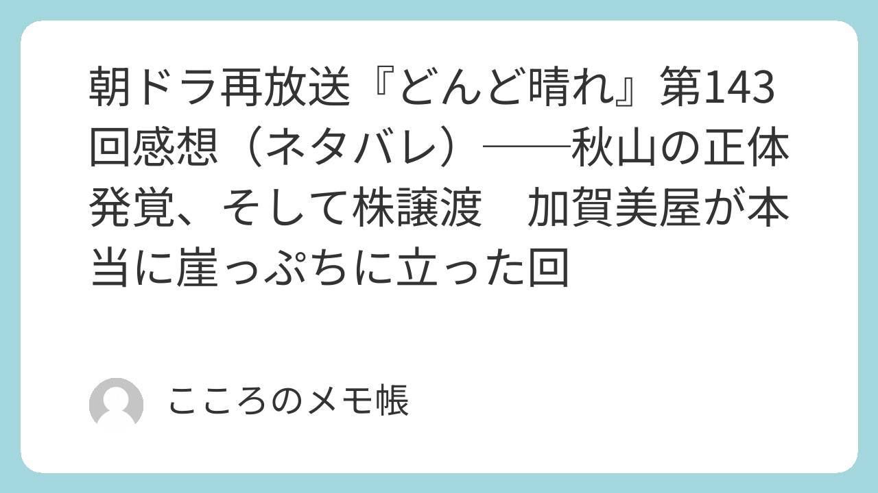 今回の第143回でまず決定的だったのは、これまで感情や疑惑のレベルで語られていた秋山の危険性が、ついにかなり具体的な資料と構図を伴って示されたことだと思う。大手ホテルチェーン、外資グループ、盛岡のリゾート開発、そして加賀美屋。これまでバラバラに見えていた点が一本の線としてつながり、秋山が単なる怪しいコンサルではなく、加賀美屋を買い叩く側の人間かもしれないというところまで話が動いた。その意味で今回は、家族の感情論や勘の話ではなく、加賀美屋が本当に“外から狙われていた”という事実が見えてきた回だった。