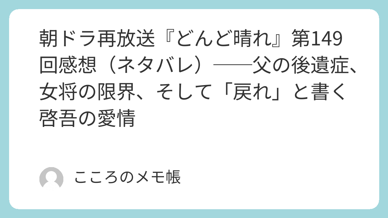 そして最後にやっぱり強かったのが、啓吾が意識を取り戻して最初に夏美へ伝えた「すぐに戻れ」という言葉だ。自分の声が以前のように出ないこと、右手が思うようでないこと、その現実を受け止めた直後に、自分の不安を訴えるのではなく、夏美に戻れと書く。これはかなり啓吾らしいと思った。表面だけ見れば冷たい。でも実際には、「自分を理由にお前の居場所を見失うな」という父親なりの愛情なんだろうなと思う。夏美の困り顔がすべてで、父のそばにいたい娘としての気持ちと、父本人から加賀美屋へ戻れと言われる苦しさがそこに全部出ていた。第149回は、加賀美屋の持久戦がさらに厳しさを増す回であると同時に、夏美が若女将である前に朝倉家の娘であること、そしてその娘がどこへ立つべきかを、父親自身に突きつけられる回だったと思う。