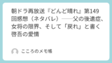こういう展開って、ベタだし、ご都合主義だと言われたらたしかにそうなんだけど、自分はこういう分かりやすいオールスター集結展開は嫌いじゃない。半年間どんど晴れを見てきて、いよいよ最終週へ向けて、あちこちに散っていた人たちが一気に加賀美屋へ収束してくる感じがあって、普通にテンションは上がる。