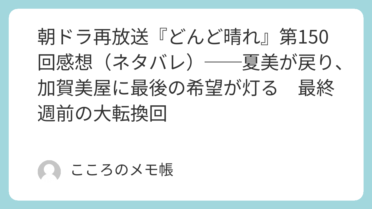 第150回は、横浜で父のそばにいたい娘としての夏美と、盛岡で加賀美屋を支える若女将としての夏美が、ついに一つの決断へ向かう回だった。啓吾は倒れた体でなお「お前は若女将」と書き、房子も智也もまた、夏美を朝倉家に引き留めるのではなく、加賀美屋へ送り返す。その一方、盛岡では秋山たちが事業再生計画書を持ち込み、ついに加賀美屋の経営権を完全に奪う寸前まで追い込んでいた。しかも秋山は半年前から加賀美屋株の3%を取得していたという新事実まで明かし、状況はさらに絶望的になる。だが、そんなギリギリの局面で夏美が戻ってきた。そして環には、ついに座敷童の影が見える。今回は、最終週を前にして、危機と希望の両方が一気に動き出した大きな転換回だったと思う。