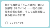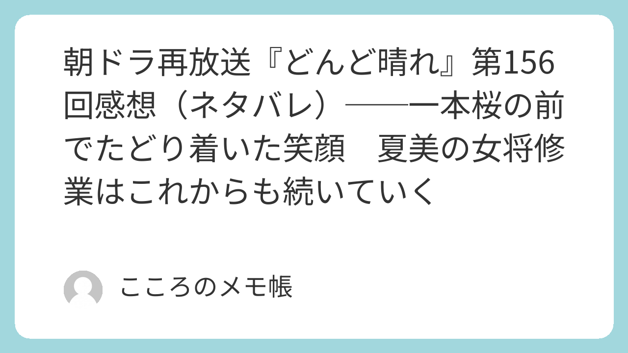とりあえず今は、夏美をはじめとした登場人物たちの成長の余韻に浸りながら、この感想記事を終えたい。おそらく、次のアンコール枠『ひまわり』については感想記事は書かないと思う。だから、『どんど晴れ』全156回の通常の感想記事としてはこれで本当におしまいだ。こんな記事でも読んでくれた人には感謝したい。ありがとうございました。