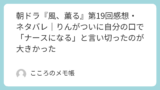 今回まずよかったのは、虎太郎との場面だった。りんは奥田家では勢いでナースになると言ったものの、本当は不安ばかりだと打ち明ける。それに対して虎太郎が「だいじだ。りんならできる」と言うのがすごくよかった。派手な言葉ではないけれど、虎太郎はやっぱりりんのことを、ちゃんと「できる人」だと見ているのだと思う。ここで余計な理屈を足さずに、ただ背中を押す言葉を渡せるのが虎太郎らしかった。