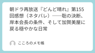 2026年4月17日に放送された『どんど晴れ』第155回。 第155回は、加賀美屋をめぐる争いがようやく“勝ち負け”の論理から一歩はみ出し、人の心や継承の話へ着地し始めた回だった。東京では夏美と柾樹が岸本会長におもてなしの心を訴え、ついに加...